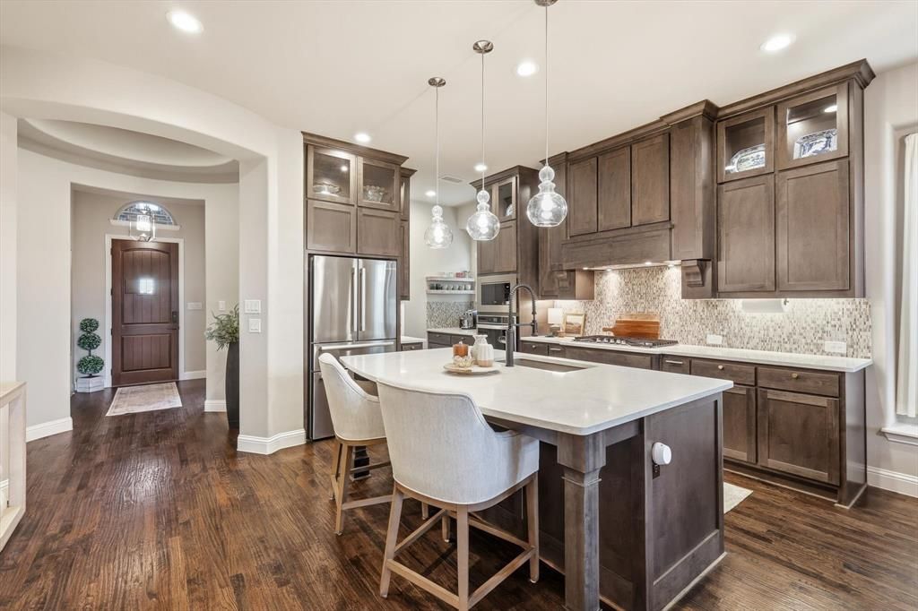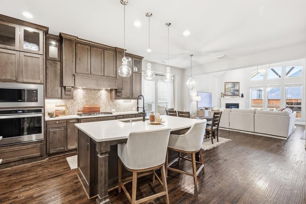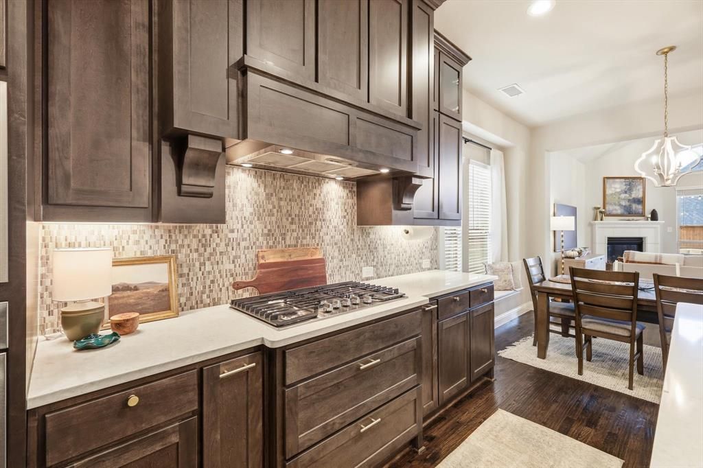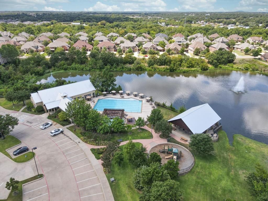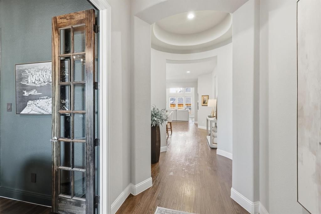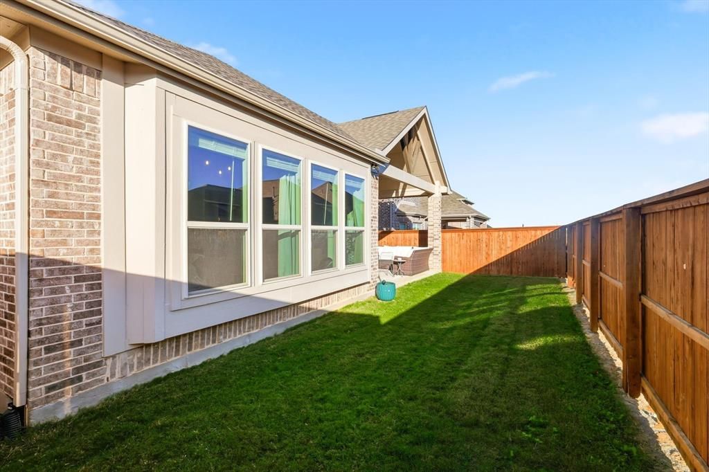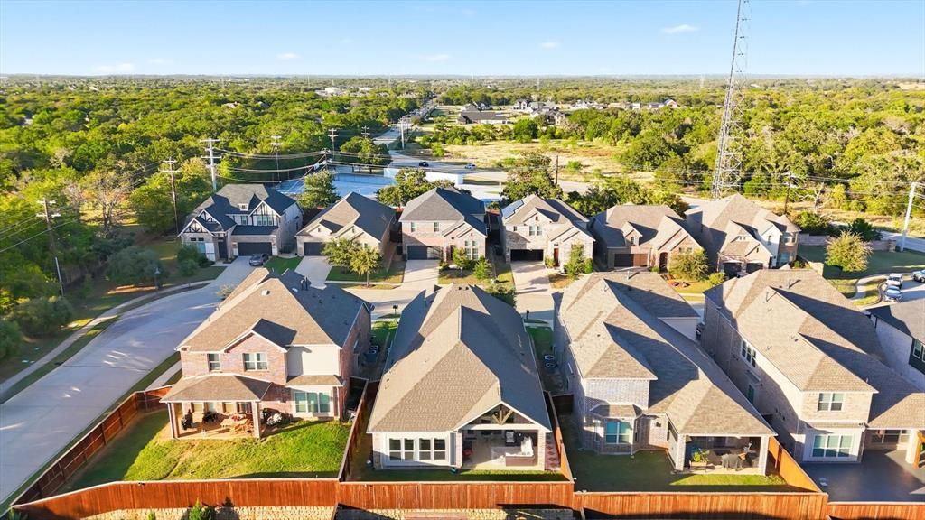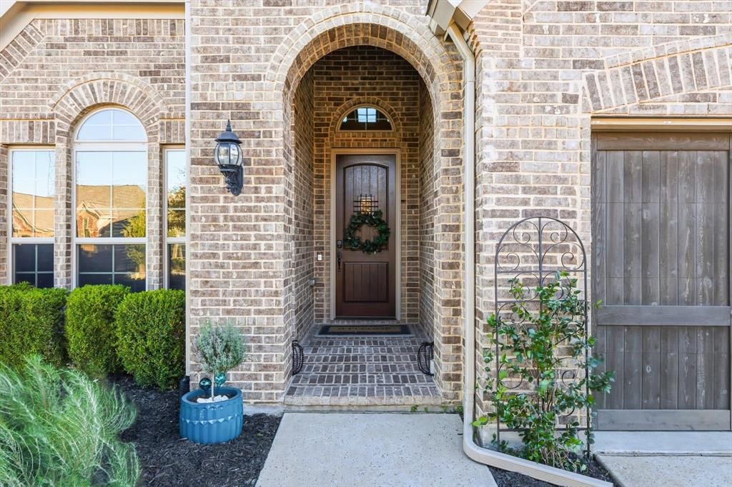 Beautiful Single-Story Home in Prime Lantana Location! Discerning buyers will love this stylish, 2019-built home located in a quiet cul-de-sac in the front section of Lantana. The elevated lot offers privacy in the backyard and quick access to major roads, shopping, dining, and DFW Airport (25 minutes). Inside, upgraded red oak hardwoods, custom cabinetry, specialty tile, and soaring ceilings create a warm, open feel. Architectural details"”wood beams, a rotunda ceiling, and butler's pantry"”add character and charm, while curated light fixtures throughout elevate the look. The flexible front room can serve as a study, fourth bedroom, or chic "Speakeasy" lounge with its electric fireplace and moody vibe. The kitchen impresses with soft-close cabinets, pull-out spice drawers, glass-front uppers, and a custom vent hood. A butler's pantry doubles as a coffee bar, and the oversized walk-in pantry is a dream! Light-filled living and dining areas enjoy south-facing windows, a vaulted ceiling with wood beam, and a cozy gas fireplace. The split bedroom layout ensures privacy for the spacious primary suite, featuring a stunning bath and large walk-in closet. A built-in mudroom off the garage entrance to the laundry area adds everyday convenience. Outdoors, the covered patio with vaulted ceiling and party lights sets the scene for easy entertaining, and the manageable yard keeps maintenance simple. Enjoy Lantana's resort-style amenities"”two fitness centers, five pools, tennis and pickleball courts, trails, and year-round community events. Front yard maintenance is included in your HOA fee. The newest elementary school is just two blocks away, and golf memberships are available at the Lantana Golf Club.