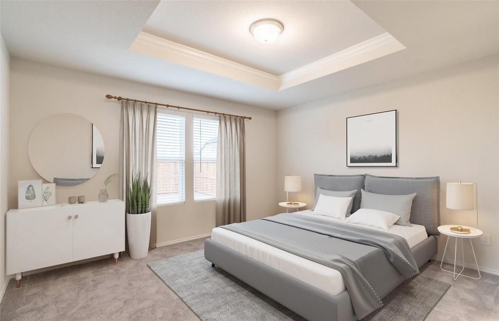 Travis Ranch by Centex in Forney. One-story Taft plan - Elevation Q. Available NOW for move-in. 3BR, 2BA + Large shower with linen closet in owner's bath + Double vanity in owner's bath + LVP flooring + White cabinets with quartz countertop + On-site elementary school + Community pool and splash pad - 1,512 sq. ft. Spacious home with two secondary bedrooms and a large gathering room.