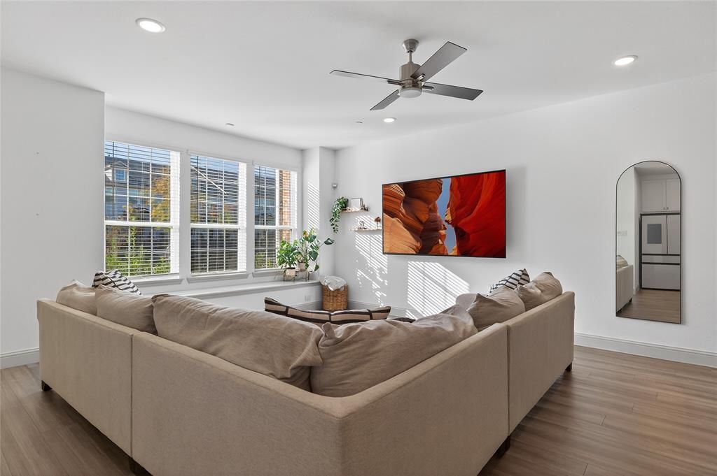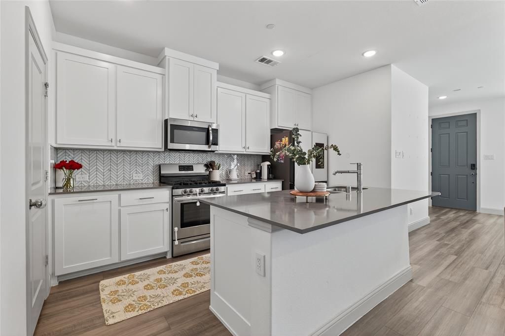 Welcome home to this beautifully designed townhome in the heart of Frisco's premier master-planned community, The Grove - where modern comfort meets thoughtful design and effortless living! The bright and open floor plan welcomes you with tall ceilings, abundant natural light, and elegant finishes throughout. The kitchen is a true centerpiece of the home, featuring stainless steel appliances including an upgraded dishwasher, granite countertops, abundant cabinetry and an oversized walk-in pantry. A spacious island anchors the open-concept layout, flowing seamlessly into the living and dining areas - perfect for entertaining or relaxing at home. On the main level, you'll find exceptional storage with a massive under-stair closet, a convenient mudroom area, and a coat closet, along with a stylish half bath. Upstairs, the serene primary suite offers a spa-like retreat with dual sinks, a large walk-in shower, and a generous walk-in closet. Two additional bedrooms - each with walk-in closets - share a full bath with a soaking tub. A flexible open space provides the perfect area for a home office, playroom, or second living area. The oversized two-car garage includes a sleek epoxy floor and an EV charger - ideal for modern living. Enjoy a low-maintenance lifestyle with HOA dues covering exterior maintenance, front yard landscaping, and irrigation. Residents of The Grove enjoy resort-style amenities, including pools, a fitness center, clubhouse, playgrounds, dog park, and scenic walking and biking trails. Centrally located and minutes from Frisco's best dining, shopping, and entertainment - including The Star, Legacy West, and top-rated Frisco ISD schools - this townhome offers the perfect balance of style, function, and convenience. With its warm design, modern upgrades, and unbeatable location, this home truly captures the best of Frisco living!