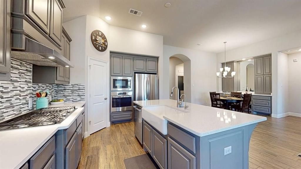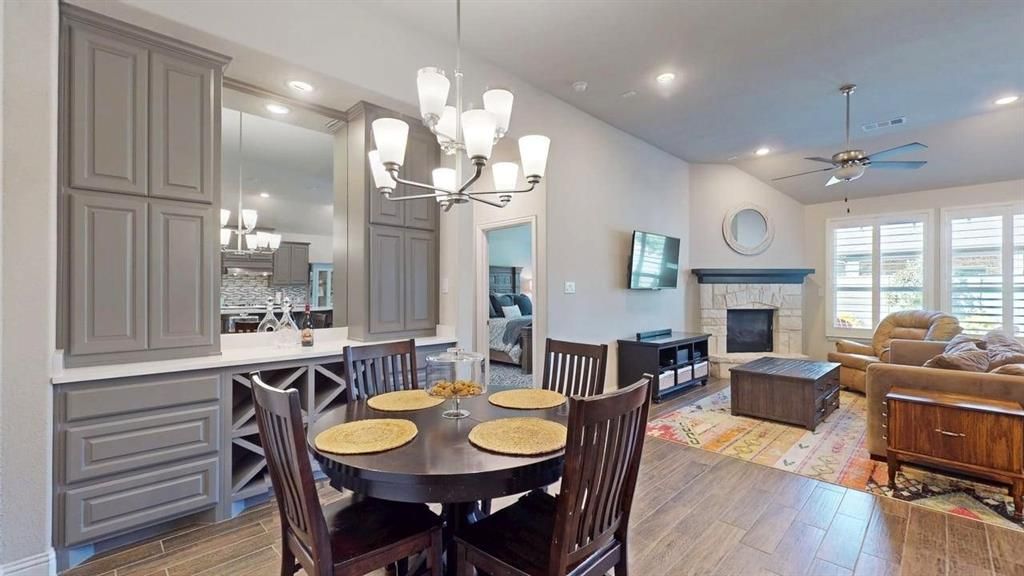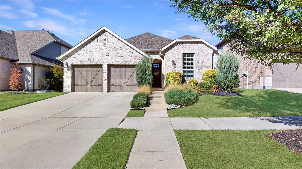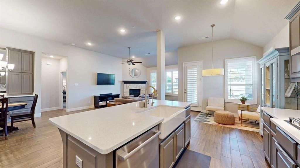 Beautifully landscaped single-story in Harvest with brick elevation! Terrific location only two houses down from the Harvest Barn and community parks! Inside you will find 4 bedrooms, 3 full baths, formal dining area with convenient built-ins, spacious game room, and 2-car garage! Upgrades and amenities include gorgeous wood-look tiling throughout main living areas, designer paint tones throughout, upgraded lighting fixtures, shutters throughout, an open concept layout great for entertaining, split bedrooms for added privacy, stone family room fireplace, and MORE! Gourmet kitchen boasts a large island with breakfast bar and farm sink, quartz countertops with a glass tile backsplash, an abundance of cabinetry and counter space, stainless appliances with a gas cooktop, and cozy eat-in area. Primary bedroom secluded at the rear of the home offers a luxurious ensuite with dual vanities and makeup vanity, garden tub, separate shower, and large walk-in closet. Enjoy evenings in the backyard on the expansive patio or around the fire pit! Harvest offers amenities for everyone to enjoy - fitness centers and community pools, miles of walking trails, fishing and kayaking, endless community events, and MORE!