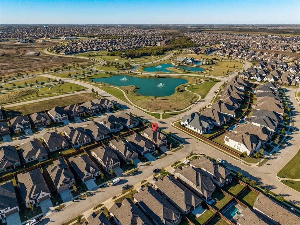 This oversized corner lot with views of the pond and amenity center is, without a doubt, one of the best locations in the entire Sandbrock Ranch community. Featuring a versatile floor plan with 4 bedrooms and 3.5 bathrooms, this home is thoughtfully designed for both entertaining and everyday living. The kitchen offers double countertops, custom cabinetry, and upgraded finishes, flowing seamlessly into the open living and dining areas. Natural light fills the home through the extended dining windowsill and the bay windows in the primary suite, highlighting the beautiful views beyond. Enjoy the amenity center within walking distance and relax while overlooking the pond and fountain. Sandbrock Ranch offers resort-style amenities including pools, a fitness center, fishing ponds, a treehouse, walking and biking trails, and spacious dog parks. This home combines luxury, comfort, and a prime location in one of Aubrey's most desirable master-planned communities.