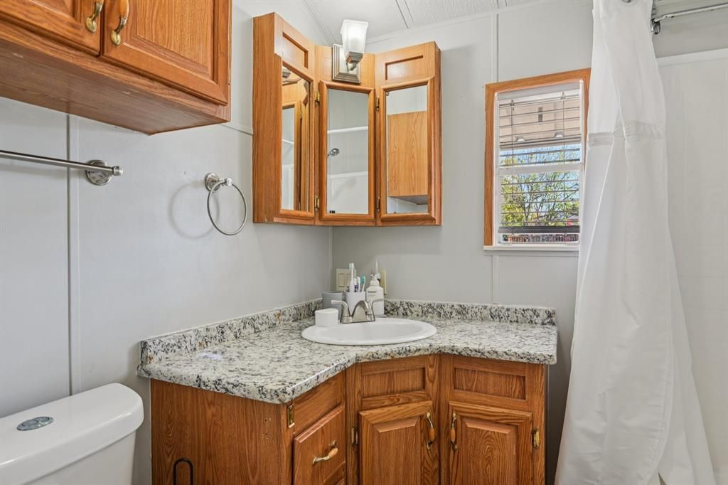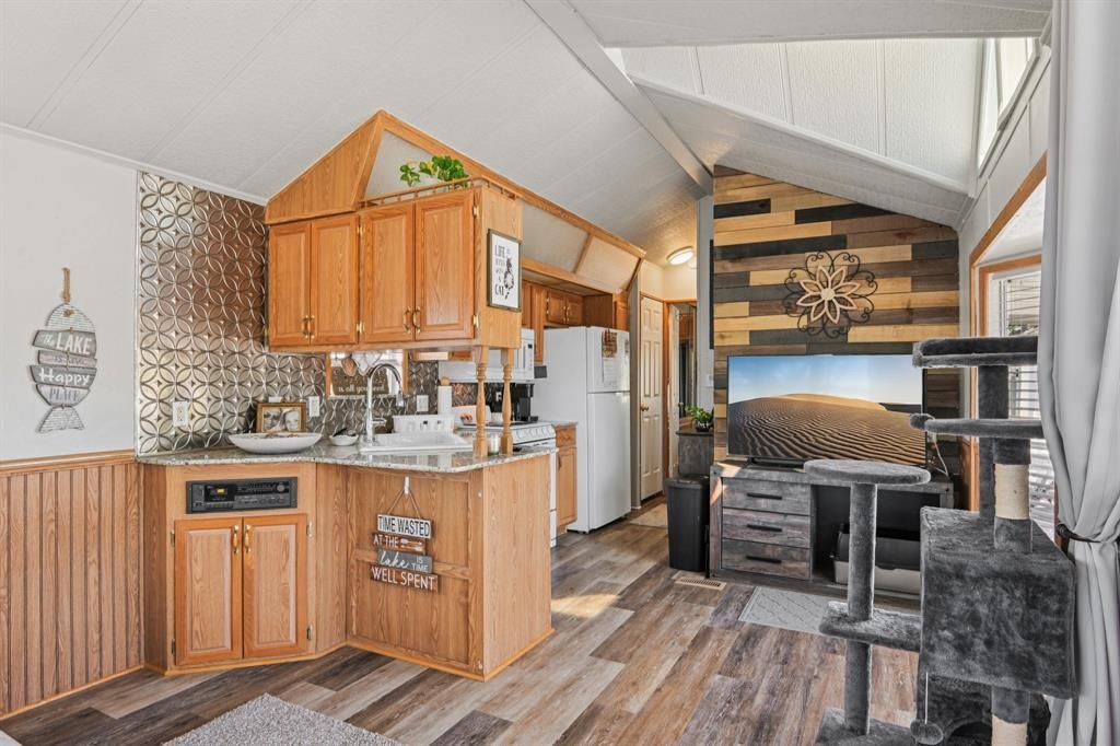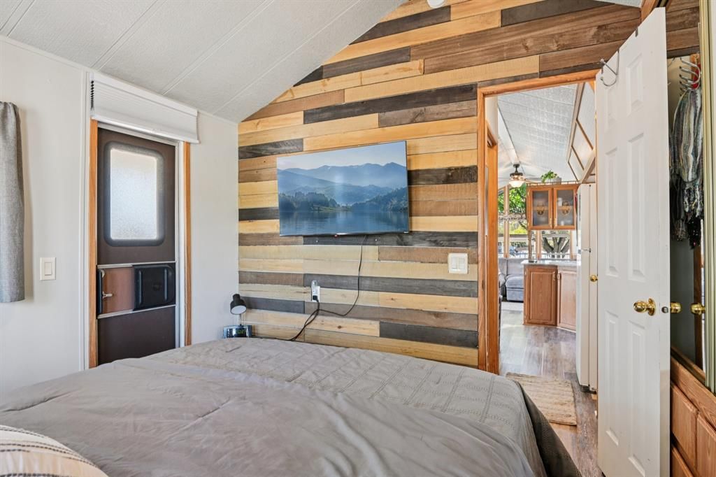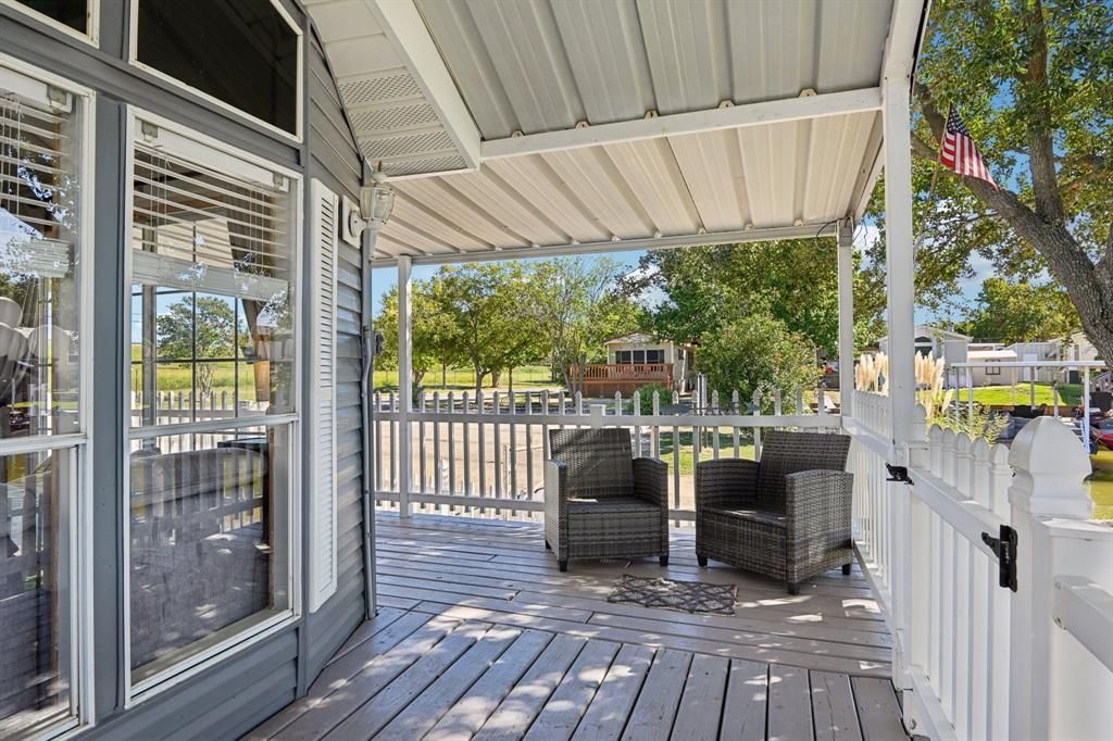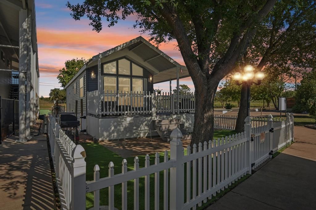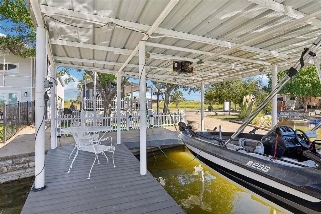 Lake Granbury Waterfront home located just off the Historic Granbury Square and the Granbury City Beach! Welcome home to Lake living! This cute and cozy Park Model home is located in the highly sought after community of Brazos Harbor! Covered boat dock with electric and cradle boat lift, plenty of deck space around the dock, sturdy stone sea wall, and located right next to the boat ramp! This is the absolute premier location in Brazos Harbor. Outside this home is a white vinyl fence surrounding the entire property, large mature shade trees front and back yard, artificial turf grass that requires no maintenance and stays green all year long! Fenced in back patio area overlooking Lake Granbury and your boat dock, private driveway, and a cute as a button storage building that matches the main home exterior. The ultimate showcase is the covered deck that runs the length of the home and wraps around the end of the home. Watch the boats and watch the sunsets over the Lake! Let's talk about the home! Park model 1 bedroom, 1 bath, 396 square feet built in 1995. Vinyl exterior siding and a brand new shingle roof! Inside there is beautiful wood look vinyl flooring throughout. No carpet! Granite countertops in the kitchen and bathroom. Full kitchen appliances. Electric stove, built in microwave, refrigerator, and washer dryer combo. Living room is very spacious and has full windows that look out to the Lake and your dock. Rustic and appealing ship lap siding accent wall in the living room. Functional kitchen with a breakfast area just off the kitchen that looks out to the boat ramp and Lake. Full bathroom with granite and shower. Master bedroom features ample cabinets and storage and an access door. Master bedroom also features very rustic and appealing accent wall with ship lap siding. This home is very clean and shows pride of ownership throughout. Home has City water and City sewer connections, space for a small boat trailer ,and a storage building. This is a must see home!