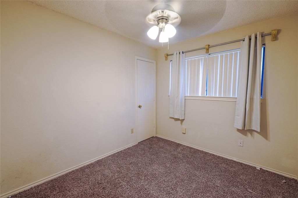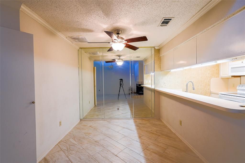 Spacious ground-level condo with functional layout and convenient Carrollton location. Living area features vaulted ceilings, tile flooring, and a wood-burning fireplace. Open dining area connects to the kitchen, which offers ample cabinetry, counter space, and a pass-through to the living room. Primary bedroom includes carpet and ceiling fan with direct access to the full bath. Bathroom offers a tub and shower combination with built-in storage. Covered patio provides additional outdoor space. Attached garage offers secure parking and extra storage. Located near major highways, shopping, dining, and Addison amenities. Property presents an opportunity for updates and customization.