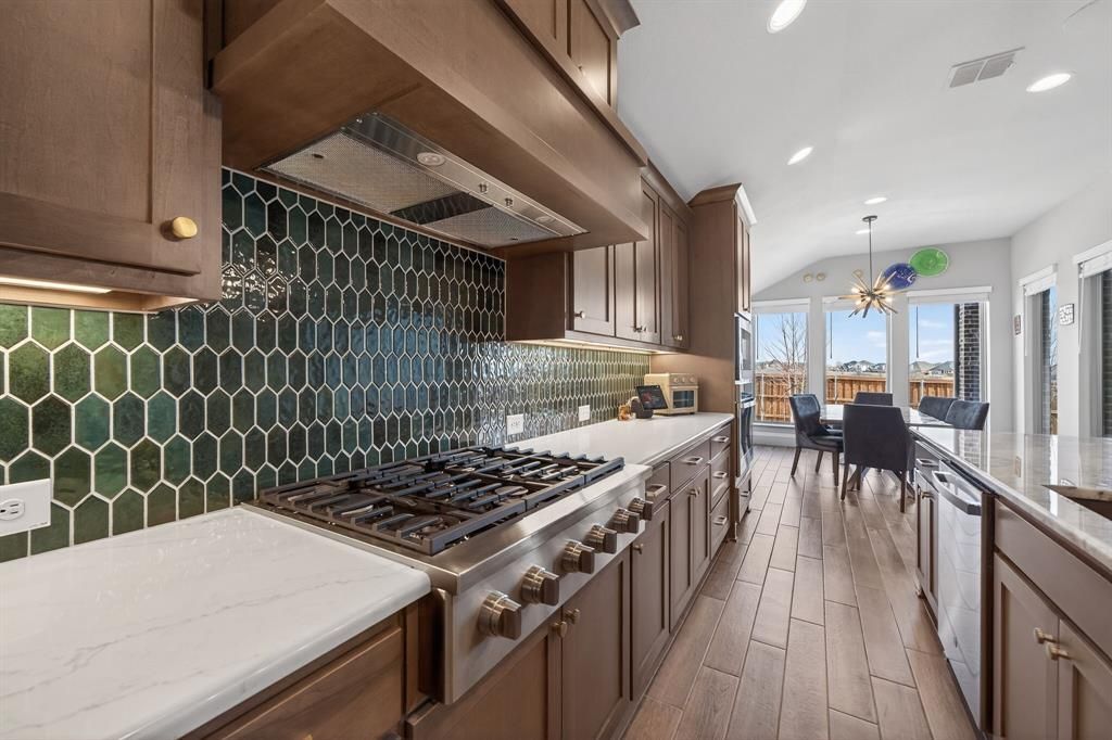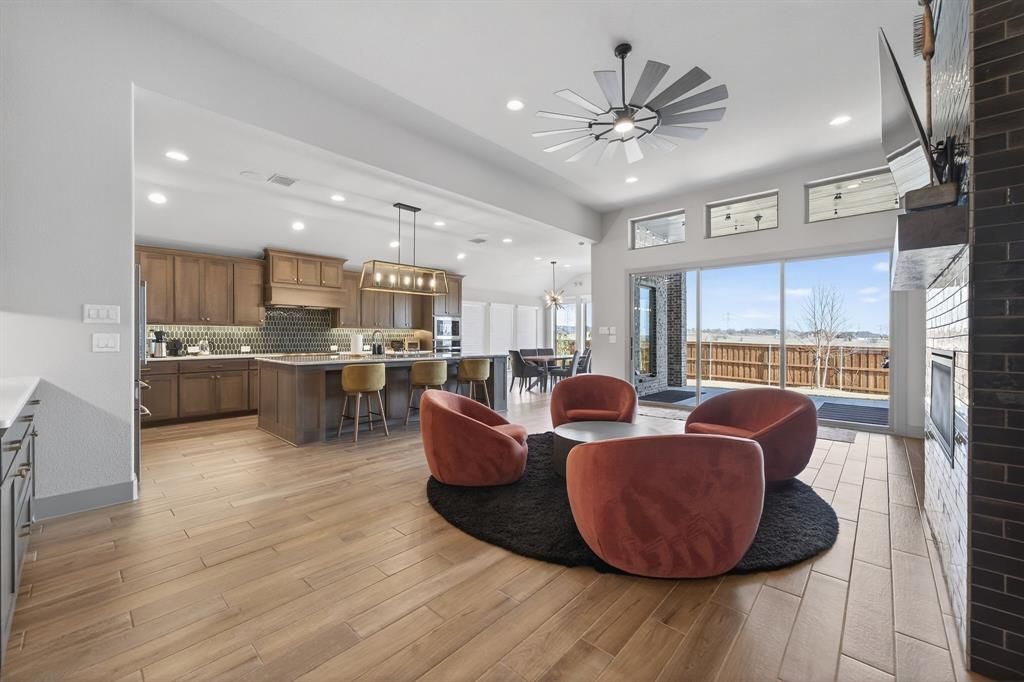 Straight out of a design magazine, this stunning home showcases over $150,000 in thoughtfully selected builder upgrades, a functional open-concept layout, and a desirable split-bedroom floor plan. The chef's kitchen anchors the home with 3CM engineered quartz countertops, an oversized island, 36 inch commercial-style 6-burner gas rangetop, upgraded ventilator insert, custom hood surround, full-height designer tile backsplash, and statement lighting. The open-concept living area is highlighted by a dramatic floor-to-ceiling tiled fireplace and a beautifully designed wine cabinet with dedicated counter space, creating the perfect setting for entertaining. A wall-of-glass multi-panel sliding door system seamlessly connects indoor and outdoor living, opening to an extended covered patio with large-format tile flooring, recessed lighting, and ceiling fan. The private backyard enjoys an elevated setting with unobstructed views and no homes directly behind, enhancing both privacy and outdoor enjoyment. Privately positioned apart from secondary bedrooms, the primary suite is a true retreat featuring vaulted ceilings and striking arched windows topped with additional upper windows that fill the room with natural light. The spa-inspired bath offers dual vanities with granite countertops, a freestanding soaking tub, and an oversized walk-in shower wrapped in full-height herringbone tile with dual shower heads and frameless glass. A versatile flex space behind double French doors is ideal for a game room, media room, or home office. Enjoy Ventana community amenities including resort-style pools and pavilion, miles of scenic walking and biking trails, parks, dog park and easy access to shopping, dining and nearby outdoor recreation. Additional upgrades include integrated music system, whole-home central vacuum, epoxy garage flooring, exterior uplighting, whole-home water softener and filtration system. A custom-level home without the custom build timeline!