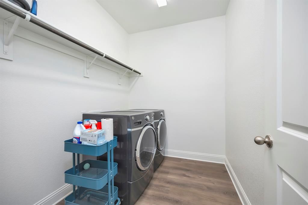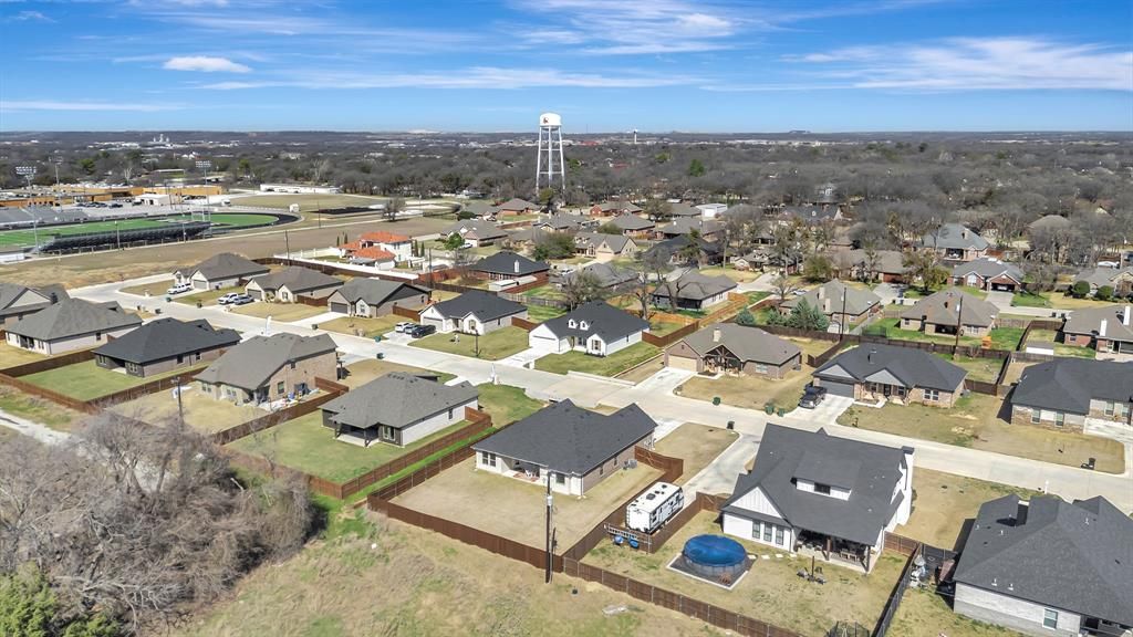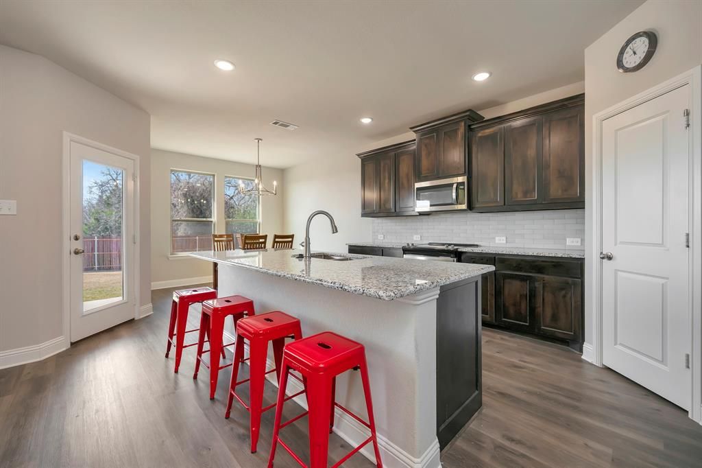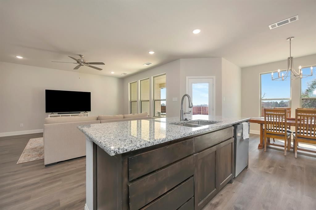 This beautifully maintained home combines comfort, style, and an unbeatable location to create the perfect place to put down roots. From the moment you arrive, the striking brick and stone exterior delivers inviting curb appeal. Inside, luxury vinyl plank flooring flows through an open concept layout designed for both everyday living and effortless entertaining. The spacious living area connects seamlessly to a stunning kitchen featuring granite countertops, stainless steel appliances, a large island with breakfast seating, and a generous pantry for added storage. The private primary suite is truly a retreat, offering plenty of room to unwind along with a massive walk in closet. The spa inspired bath includes dual vanities, a separate shower, and a relaxing garden tub. Step outside to enjoy a large covered patio that overlooks an open field with no backyard neighbors, providing peaceful views and extra privacy. Located within walking distance to the stadium and convenient to local amenities, this home checks every box for families and entertainers alike. Schedule your private showing today and see why this one feels like home the moment you walk in.