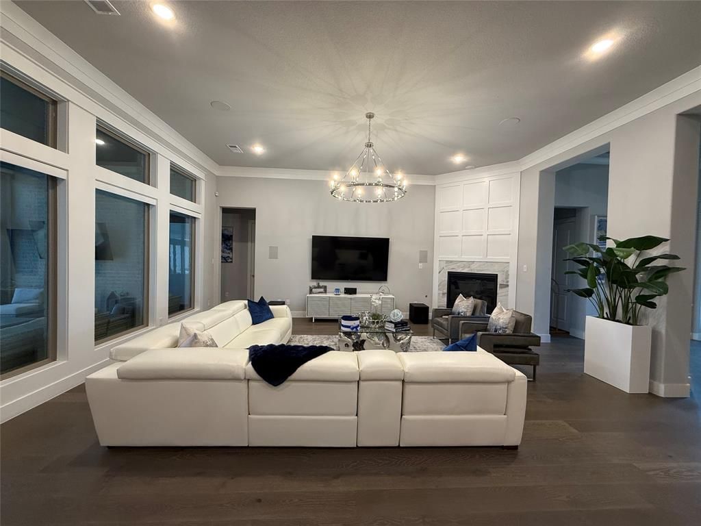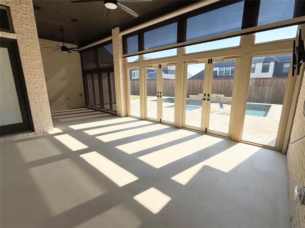 Ideally situated in the sought-after Falls of Prosper, this exquisite one-story 4-bed, 3-bath, custom-built home showcases an exceptional fusion of contemporary sophistication and enduring comfort - within Prosper ISD and zoned for Prosper High School. Set on an expansive lot of over one-third of an acre, this property offers limitless potential, elegant outdoor entertainment and shimmering pool offering peaceful relaxation. Open-concept layout with abundant natural light and engineered wood flooring throughout. Gourmet kitchen with quartz counters, stainless appliances and large island. Primary suite includes dual vanities, soaking tub, separate shower and walk-in closet. Two secondary bedrooms plus a 4th bedroom that can also serve as a study, flex or activity room. Spacious backyard features a sparkling pool and fully glass-enclosed patio, enhanced with a remote-controlled adjustable screen ideal for everyday lounging and hosting. In-ceiling speakers are installed throughout the living area, kitchen, and enclosed patio, providing seamless whole-home sound and an elevated entertainment experience. Additional highlights include epoxy-coated flooring in both garages for low-maintenance durability and a clean, polished finish, along with an electric car charger for added convenience. This home is equipped with a whole-house generator and a high-end smart camera surveillance system, offering peace of mind and uninterrupted comfort year-round. Close to shopping, dining and main travel routes. Move-in ready and a must-see!