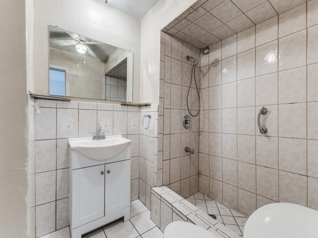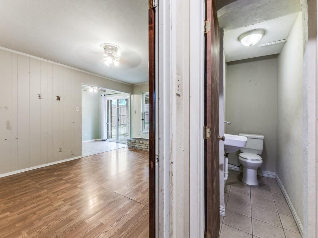 Built in 1969 and set among the rolling hills of Oak Park Estates, this two-story home carries subtle notes of Spanish Eclectic influence, expressed through its courtyard-style entry and distinctive ironwork. Brick-clad and quietly composed, it offers four bedrooms, two and a half bathrooms, and a generous, highly adaptable layout suited to both everyday living and long-term reinvention. A front courtyard creates a sense of arrival and privacy from the street. Inside, an open staircase with distinctive iron railings serves as a sculptural focal point. The family room is anchored by a masonry fireplace with a generously sized hearth and an arched firebox opening, a detail that quietly echoes the home's architectural influences. The primary suite is positioned on the first floor, offering convenience and separation, while three additional bedrooms are arranged upstairs. Each bedroom is well-proportioned and includes a walk-in closet, with one of the upstairs rooms opening to a private balcony. The home is ready for comprehensive cosmetic updates. Major systems appear in good working order, the roof was replaced two years ago, and the windows have been updated, providing a solid foundation for thoughtful improvements over time. The attached rear-entry two-car garage is complemented by a separate two-car carport. The backyard is enclosed by a wooden privacy fence, offering a secure and flexible outdoor space. Oak Park Estates is known for its beautiful trees, gently varied topography, and its greenbelt along Five Mile Creek, with access to the Kiestwood Trail and the Kiest Park Conservation Area. Kiest Park and the Oak Cliff Nature Preserve are nearby, along with convenient routes to Highway 67, I-35, and Loop 12 for access across the metroplex. Bishop Dunne School and Carpenter Elementary are nearby. This is a home with strong architectural bones and considerable potential, ready for a new chapter shaped by careful updates and creative vision.
