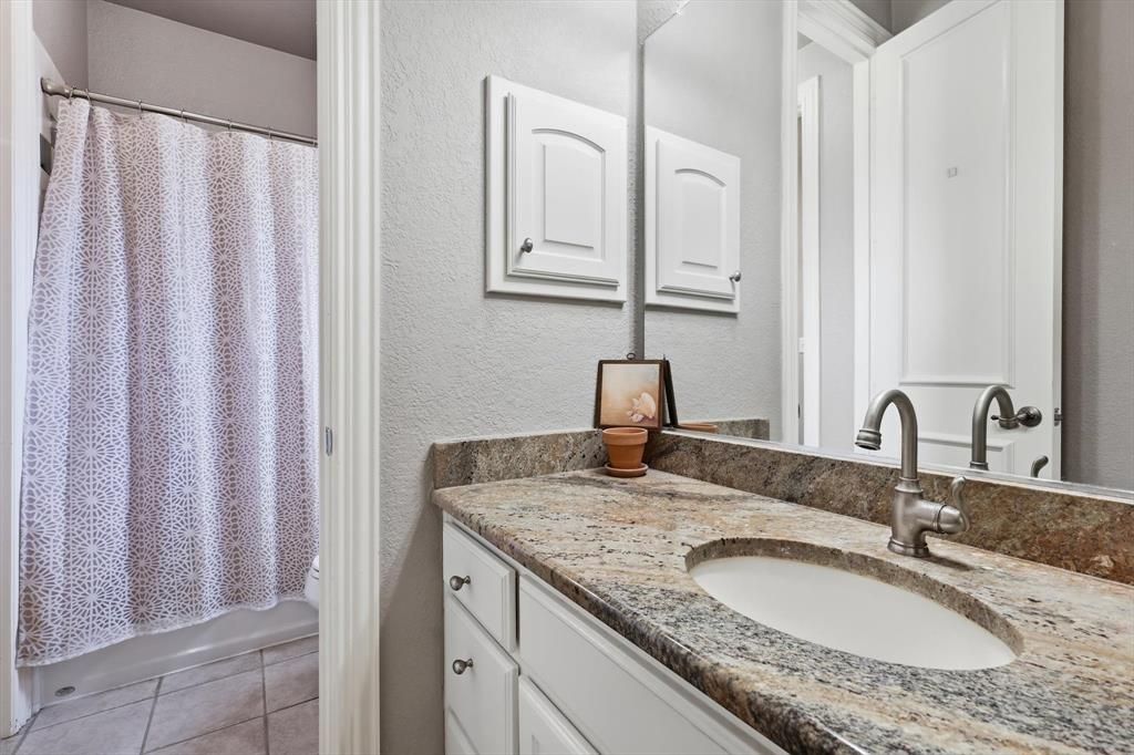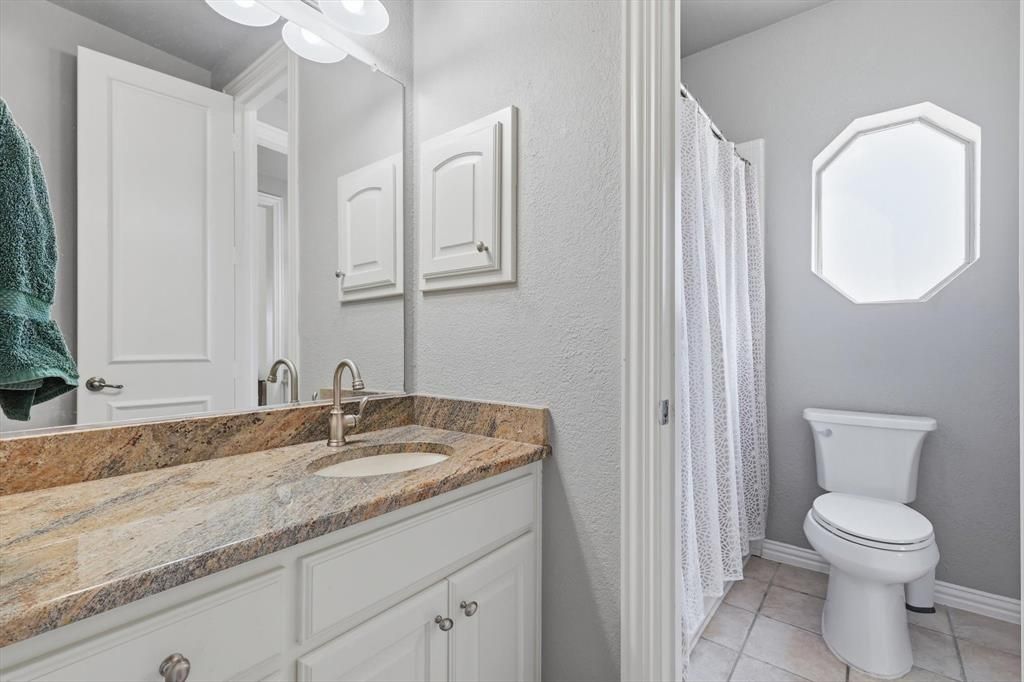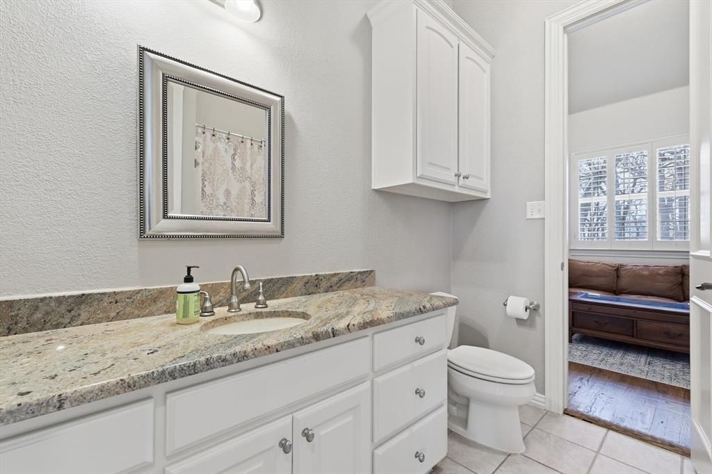 Imagine living in a small, quiet gated community with beautiful treed views & community amenities including a pool, tennis court & fully stocked fishing pond. It may sound like a dream, but it's a reality with this gorgeous 4-bedroom, 3-bath custom home situated on a .7 acre lot in Corinth Forest. A grand covered front patio greets you as you arrive & creates the perfect place to enjoy your morning coffee. With a sought-after open floor plan featuring all bedrooms and an office downstairs, this home transitions seamlessly through every stage of life. The spacious living room is a superb place to gather with soaring ceilings, hand-scraped hardwood floors, built-ins surrounding a handsome stone fireplace & a wall of windows offering views of the backyard & lots of natural light. Prepare gourmet meals in the island kitchen, featuring granite countertops, pantry, prep sink & stainless steel appliances, including double ovens & gas cooktop. Split primary suite has a private patio access, a luxurious bathroom with updates & large walk in closet. Upstairs you will find a huge game room with built-in storage, mini fridge, a sizeable storage closet & 2 doors to walk out attic spaces. Other amenities include wood floors in all bedrooms, built-ins in the office, granite counters in all baths, an oversized 3 car garage & large outdoor storage closet on the side of home. The backyard is a must-see with an expansive patterned concrete patio & cozy firepit, all backing to an open wooded view of the community pool & tennis court. Ideally located near Lake Lewisville, Village Parkway 2499 and 35 for easy access to all the conveniences.