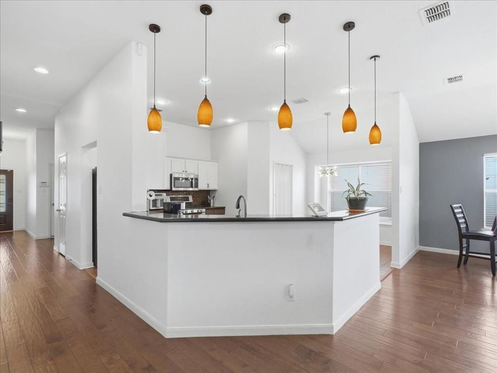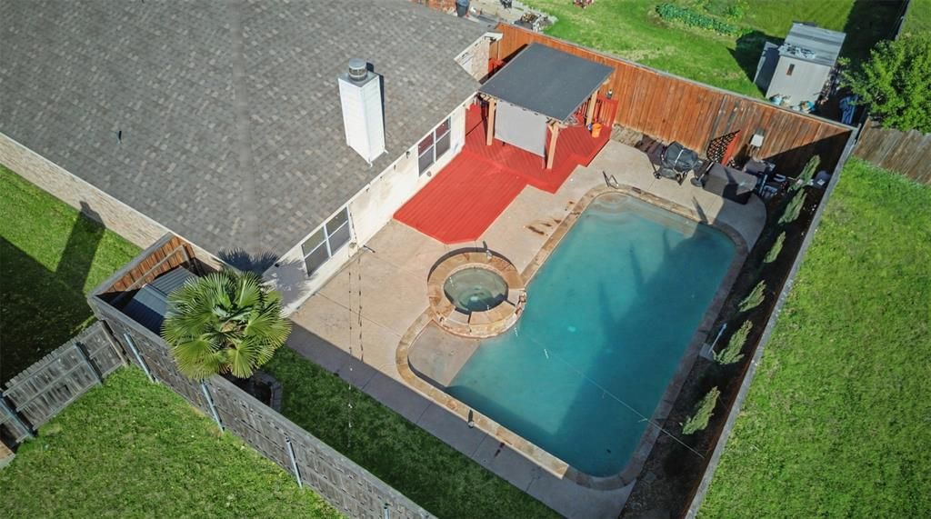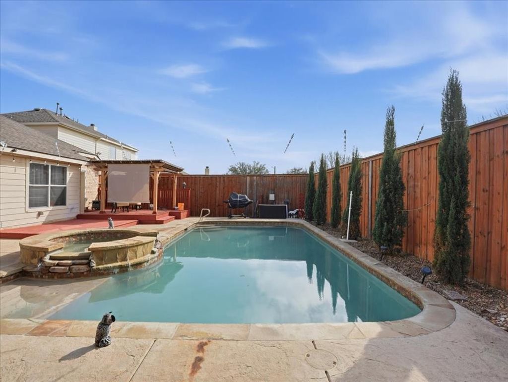 Step through French doors to your own private backyard retreat with a sparkling pool, hot tub, privacy fence, shaded pergola, and wood deck - perfect for summer cookouts and entertaining year-round. This 4-bed, 2-bath in Brookfield at Grand Prairie offers 1,935 square feet of single-story brick with vaulted ceilings and a fireplace. Open layout connects the living area, dining space, and kitchen. Kitchen has a gas range, tile backsplash, pendant lighting, and peninsula bar seating with a breakfast nook off the kitchen. Primary suite features a vaulted ceiling, wood accent wall, and a private bath with double vanity and walk-in shower. Attached 2-car garage. Zoned to Grand Prairie ISD. About 25 minutes to Downtown Dallas via I-20 and 20 minutes to Arlington. Minutes from Joe Pool Lake, Epic Waters, and Grand Prairie Premium Outlets. Pool homes in Grand Prairie at this price point are rare! Schedule a private tour to experience it firsthand.