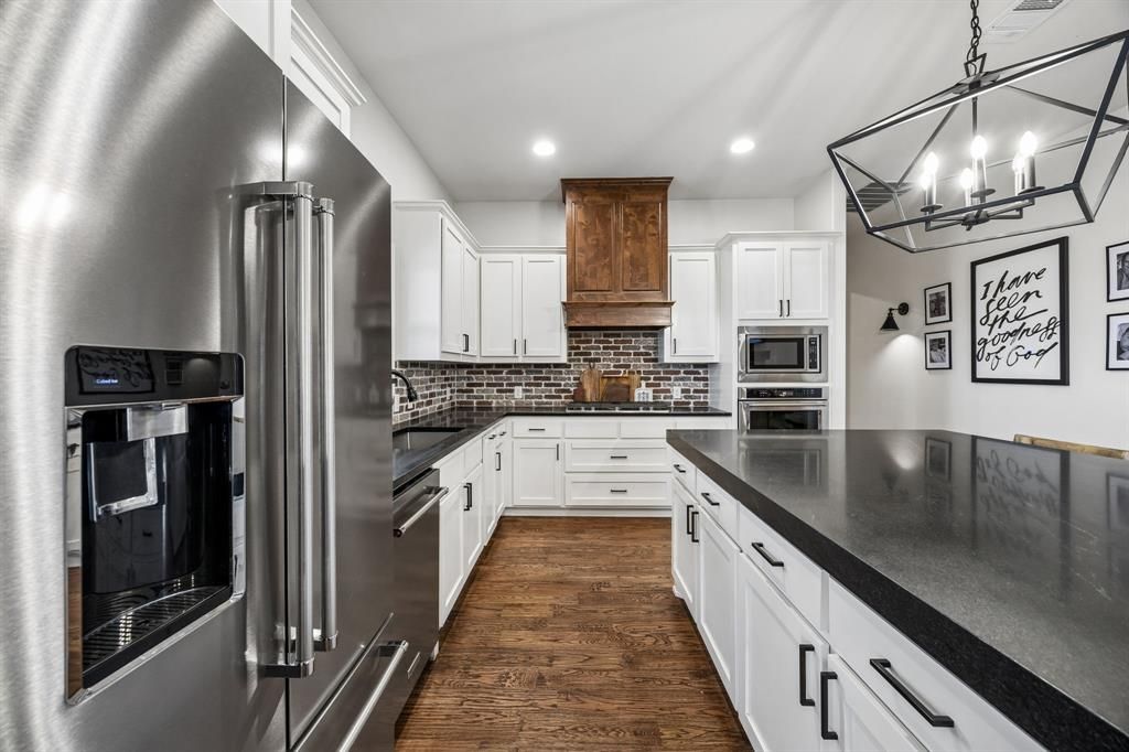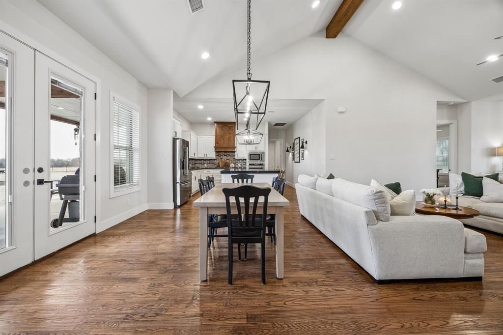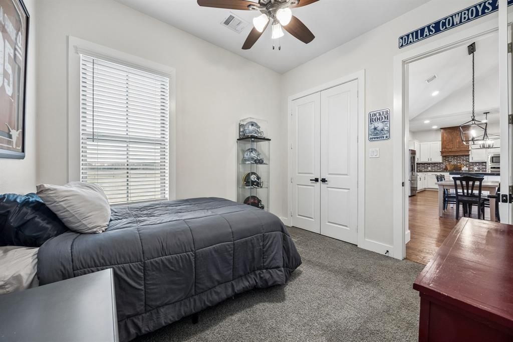 Situated on nearly two acres in a peaceful country setting within Community ISD, this exceptional four-bedroom, three-bath home offers space, privacy, and freedom "” with no HOA, MUD, PID or city taxes. A long private driveway provides abundant parking and leads to a massive oversized 27x35 two-car garage. The inviting front porch welcomes you into a spacious and impressive entryway, highlighted by stunning custom double doors that create a memorable first impression. Inside, vaulted ceilings and a beautiful stone wood-burning fireplace with gas start anchor the expansive living room. A dedicated study offers the perfect work-from-home space, while a secondary bedroom is currently being used as a gym, showcasing the home's flexibility. The kitchen is designed to impress, featuring a large island, shaker-style cabinetry, abundant counter space, and an incredible walk-in pantry many will envy. The oversized utility room offers extensive cabinetry, countertops, and storage, plus a convenient folding area located just off the primary closet for everyday ease. This open plan allows for the most perfect sized table for your eating experience or pull up a chair to your ideal island. The private primary suite is a true retreat, complete with a luxurious ensuite bath offering dual vanities, generous storage, and a custom walk-in shower with dual rainfall showerheads. Step outside to an oversized covered back patio ideal for entertaining, grilling, or simply relaxing while enjoying peaceful country views. You will see many special touches were applied in this dearly loved custom home, but don't miss the tankless water heater, well-appointed irrigation, the amazing garage storage closet, special safe, custom primary closet details, and more. With nearly two acres to call your own, this property delivers the perfect balance of comfort, function, and laid-back country living.