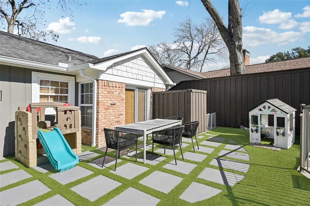 Looking for more than 500 sq ft of play or work space? The bonus-family-play room has functionality for multiple types of use at the same time! Adjacent to the kitchen, you can keep your eyes on the activity in the bonus room which makes this one of the special features of 10250 Timber Trail Drive in Timber Trail Park on the edge of the private school corridor. This 3 bedroom, 2 and a half bath, nearly 2500 sq ft home was thoughtfully updated by an interior designer over the last couple of years. Enlarging the picturesque kitchen window overlooking the turfed backyard and pool added more natural light to the open floor plan. Kitchen was updated with new cabinets, countertops, backsplash, flooring, fixtures and appliances including a vented hood and gas range. Enjoy breakfast from the eat-in kitchen bar or the seating nook off to the side. Need more dining room? Easy to entertain in your formal dining room with space for a dining table with leaves, space to store all the things you need in the additional cabinets and built-in buffet side board. The primary suite was outfitted with a walk-in closet, larger than most of its era. The primary bath has an updated shower tile and glass, a new vanity and fixtures. The guest rooms share an updated bathroom with new vanity, tub, countertops, flooring, tile, fixtures and more. The expansive outdoor living area is an oasis of its own; turfed and fenced-in there is a dining area, a TV watching area and space for multiple playsets. The pool will keep you cool in the Texas summer heat with a deep end. The spa with jets will help you unwind after a long day. Other features include a 2-car garage, French doors in multiple rooms leading to backyard, new exterior siding and landscaping. Additional updates include: new attic insulation in 2025; new roof in 2021; programmable Honeywell thermostat in 2023. Enjoy neighborhood gatherings and block parties. Only 5 min. to Northaven Trail and easy access to multiple freeways.